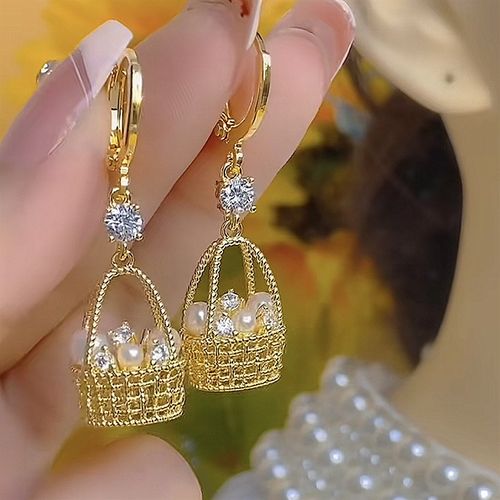 Women's Golden Pearl Zircon Flower Basket Huggie Earrings - Luxury, Fashionable, Elegant & Versatile